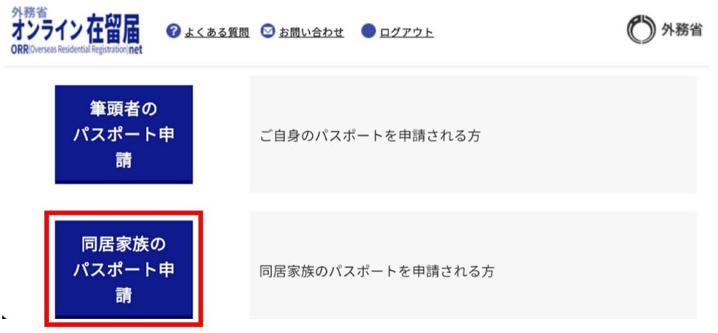 ログインしたら「同居家族のパスポート申請」をクリックします