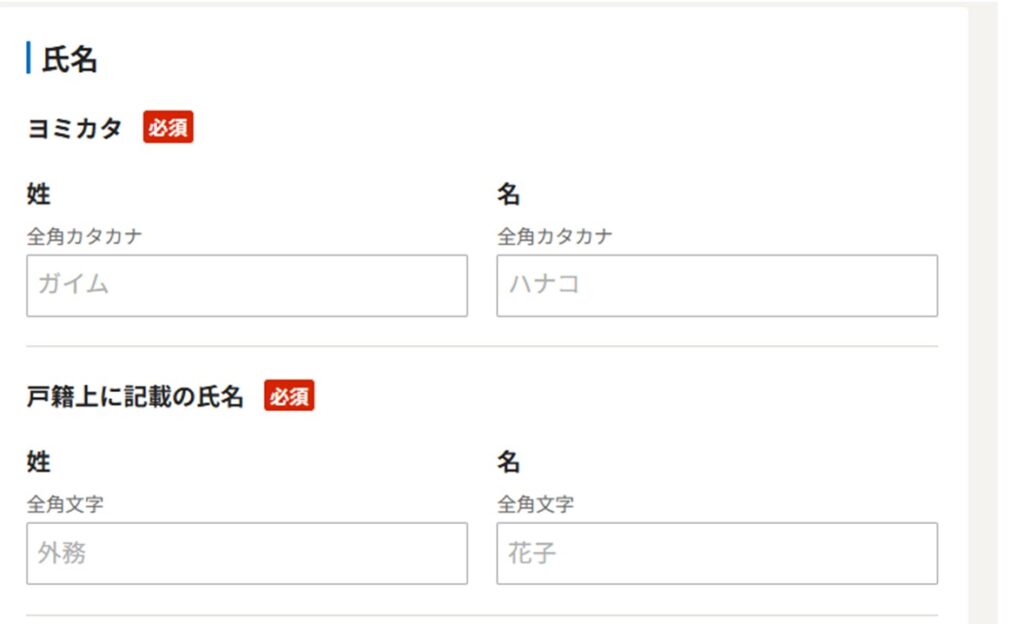 まず戸籍上の姓名入力画面です。