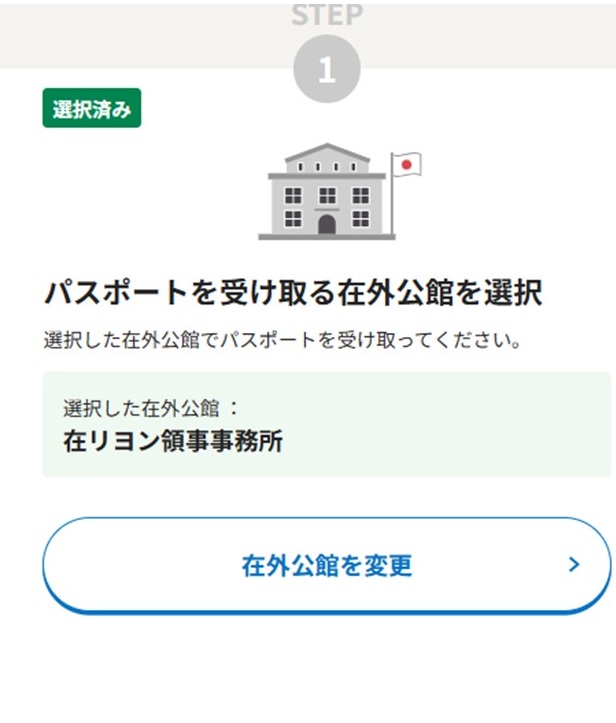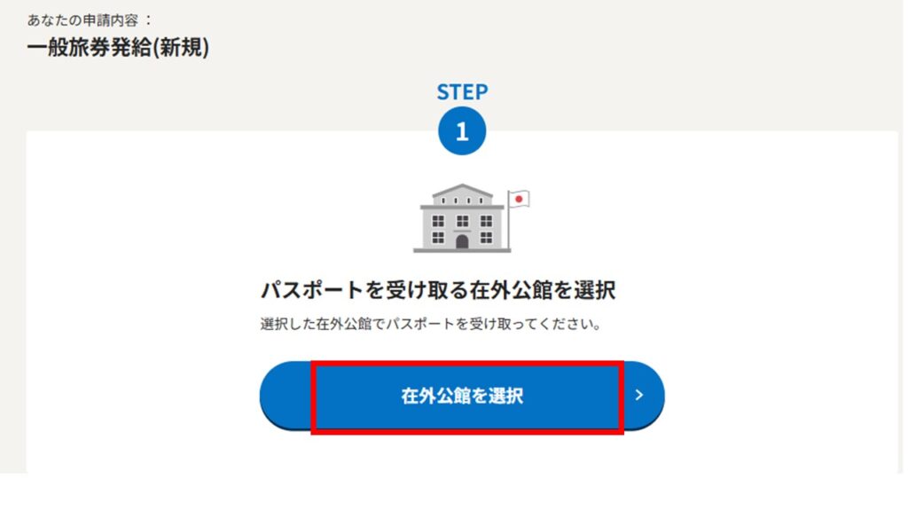 まずSTEP1は自分の管轄の大使館・領事館(₌パスポートを受け取りに行く場所)を選択するだけです。