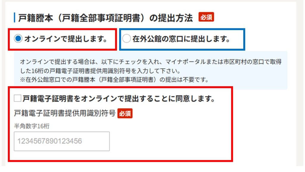 電子戸籍を取得された方は赤枠部分「オンラインで提出します」を選択・同意し、戸籍電子証明書提供用識別符号を入力します。