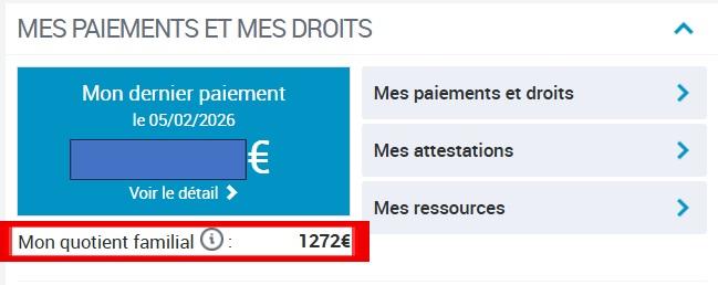 確定してから数日後に改めてマイページを見てみると、「Mon quotient familial」に今年の金額が表示されており、申告が問題なく処理されたことが確認できました。